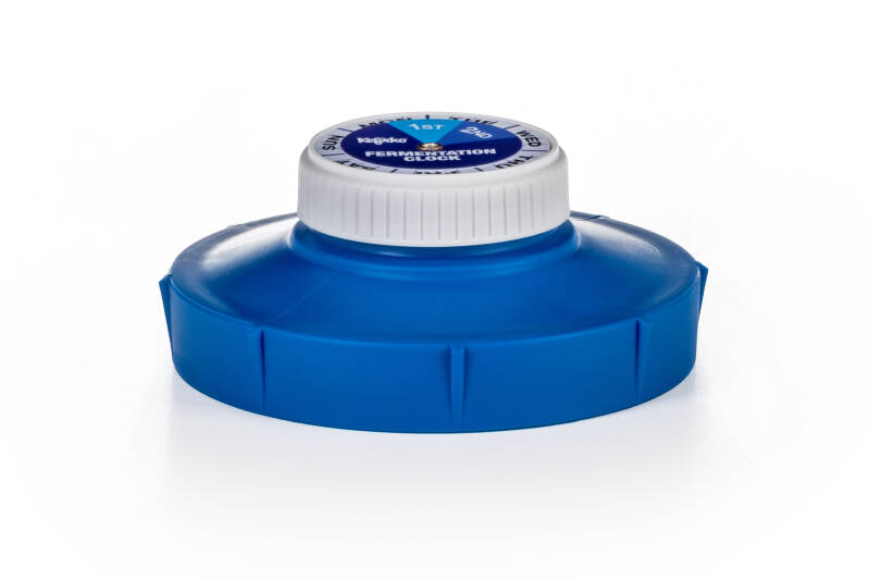 Bovenop dit deksel zie je een fermentatieklok. Deze is in het leven geroepen voor mensen die meerdere loten tegelijk maken en het soms moeilijk hebben om nog te weten tot wanneer welke pot moest fermenteren. Met de klok kan je dit eenvoudig aanduiden.